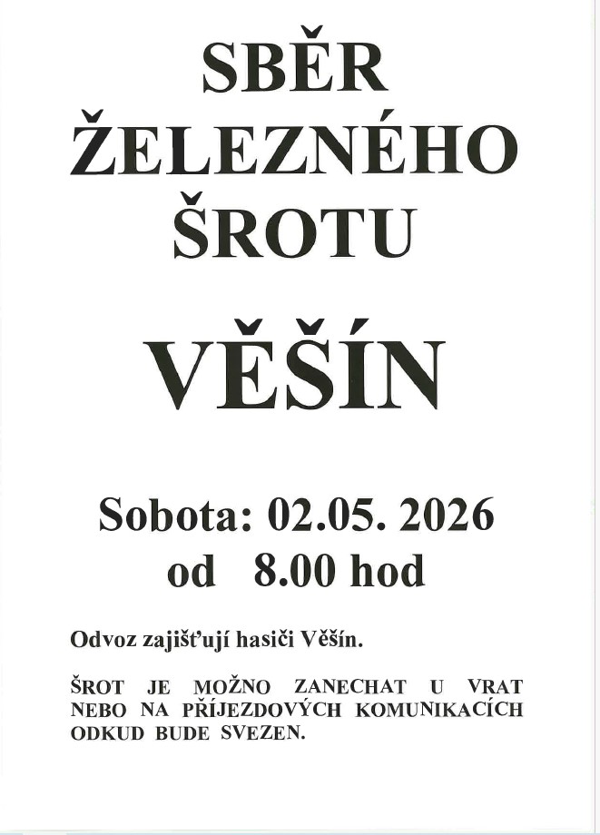 V sobotu 2. května 2026 se ve Věšíně uskuteční sběr železného šrotu. Akci organizují místní hasiči, kteří zajistí odvoz shromážděných materiálů. Občané mohou šrot zanechat u vrat nebo na příjezdových komunikacích, odkud bude svezen. Tato iniciativa je důležitá pro ochranu životního prostředí a podporuje třídění odpadu v naší obci.